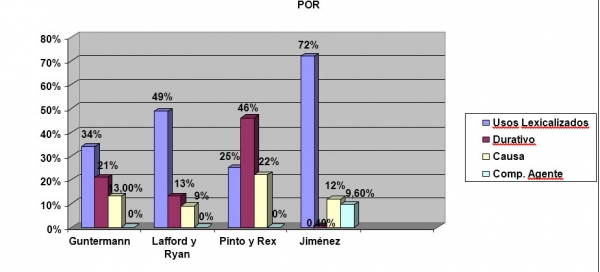 En cuanto a los valores semánticos de por, los conceptos de causa, sensación de duración y usos lexicalizados registraron un mayor porcentaje de usos correctos destacando entre los demás valores. Al igual que con la preposición para, los siguientes porcentajes son la media de los tres distintos niveles de IL de los estudiantes. Se observa, además, un uso discreto de complemento agente (9,6%) que no aparece en ninguno de los otros estudios con anglófonos.