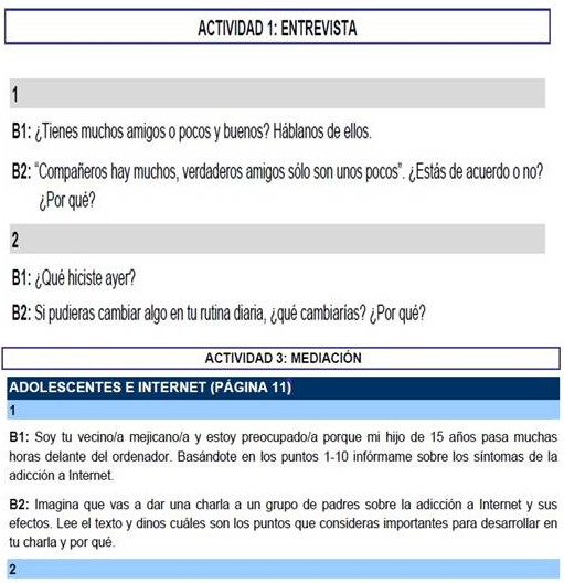 A continuación proporcionamos un ejemplo de preguntas del entrevistador del examen oral de nivel B para las tareas de interacción oral (actividad 1) y mediación oral interlingüística (actividad 3). El entrevistador cuenta con bastante input y número de preguntas/tareas como para que se repitan lo mínimo entre el grupo de candidatos de la jornada.