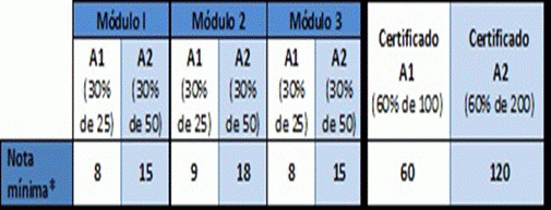 Para la expedición del certificado se requiere la calificación de "apto", que el candidato logrará si consigue al menos el 60% de la nota máxima global, y a condición de haber obtenido el 30% de la puntuación máxima en cada uno de los Módulos por separado. Esto es, como en el examen integrado-graduado la nota máxima global es de 200 puntos, aquellos candidatos que se presenten al examen de nivel A, por ejemplo, obtendrán el certificado de nivel A2 si alcanzan un mínimo de 120 puntos, mientras que se expedirá el certificado de nivel A1 a los que logren reunir entre 60 y 119 puntos [10]. En el cuadro que añadimos a continuación se puede ver de forma más analítica.