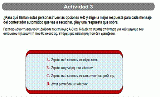 La mediación interlingüística no se examina en el nivel A, no obstante se aprovecha el uso de la mediación en algunas actividades para medir la comprensión lectora y acústica, pues sin duda el candidato de este nivel entiende mucho más de lo que es capaz de expresar en la lengua extranjera. Un ejemplo de lo que exponemos se puede observar en la siguiente actividad del Módulo III (comprensión acústica), donde se le pide al candidato que identifique la intención de cada uno de los breves mensajes que escucha en la lengua meta, pero los items están redactados en lengua griega.