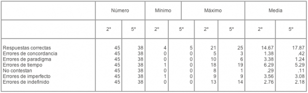 La estadística descriptiva del test demuestra que, entre los tres tipos de errores, los errores de tiempo alcanzan la media más alta, más que los de concordancia y de paradigma (Véase la tabla nº1, 6.29 y 5.29 para 2º y 5º respectivamente). No obstante, tras pasar los datos al t-test, lo que demuestra diferencia significativa entre los dos grupos son los errores de concordancia (p. 0.000) y los de paradigma (p. 0.000). Respecto a los errores de imperfecto-indefinido, la media de errores de imperfecto supera a la de indefinido, pero no muestra efecto significativo en ninguno de los dos.