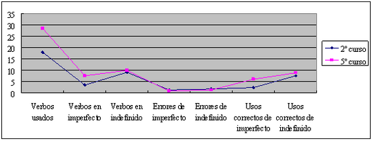 También se han clasificado los errores verbales cometidos en las composiciones. Las medias más altas se encuentran en los apartados de la concordancia (M=1.22), de presente-pasado (M=1.19), de imperfecto-indefinido (M=1.41) y de otros errores semánticos (M=1.05), siendo la media de errores de indefinido-imperfecto cuantitativamente la más alta de todas. Comparando los dos grupos, se encuentra tanto evolución positiva como negativa. Los errores disminuyen en las secciones de paradigmas, de conjugación, de indefinido-perfecto y la de imperfecto-indefinido. Las secciones que marcan una evolución positiva son las de adición y omisión de verbos, las del uso (de verbos tipo gustar y los reflexivos), la del presente-pasado, la de ser-estar, la de haber-tener y otros del semántico. Según los resultados de este corpus, por un lado, los informantes señalan la tendencia de usar más y mejor el pretérito imperfecto a medida que avanza el aprendizaje. Pero cuando más imperfectos usan, más confusión les provoca en la dicotomía imperfecto-indefinido. Por otro lado, la dicotomía presente-pasado también representa una dificultad para nuestros informantes, sobre todo en su primer contacto con el pasado, así como la de indefinido-perfecto. Estos problemas verbales no pertenecen a la aspectualidad, sino a la temporalidad.