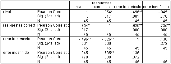 Además de la diferencia entre los dos niveles lingüísticos (el 2º y el 5º, como una variante intergrupal), también se hace el análisis de nivel lingüístico dentro de cada grupo (como una variante intragrupal). Primero en la prueba de llenar huecos, las cifras estadísticas de la correlación indican que, para el curso 5º el nivel lingüístico se correlaciona más con la distinción de tiempo que con la de paradigmas o de concordancia, pero para el 2º no queda muy claro esta dependencia. Respecto a la alternancia imperfecto-indefinido, para 2º, el grado de dependencia es mayor entre el nivel lingüístico y los errores del imperfecto; en cambio, para quinto, el grado es mayor entre elnivel lingüístico y los errores del indefinido; es decir, la correlación es altamente significativa entre el nivel lingüístico y el uso del imperfecto para segundo, pero para quinto tal correlación se encuentra entre el nivel lingüístico y el uso de indefinido.