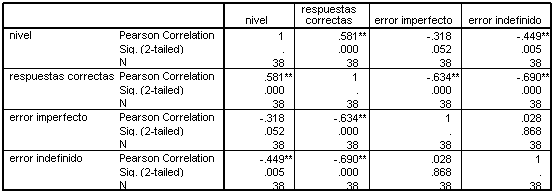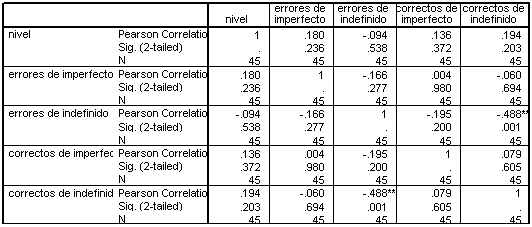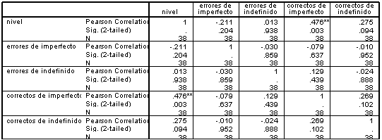 En el corpus de la redacción se observa que el nivel lingüístico se correlaciona con las secciones de forma distinta en los dos grupos. Para el 5º, la correlación significativa se encuentra entre el nivel lingüístico y las del total de verbos usados, del total de imperfectos usados y de usos correctos de imperfecto; en cambio, para el 2º, tal correlación se encuentra entre el nivel lingüístico y la de errores de indefinido-imperfecto.