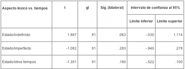 Estos resultados coinciden con los dos primeros principios de la Hipótesis del Aspecto: 1) Los aprendientes usan primero el pretérito perfecto en logros y realizaciones, a veces se extienden a actividades y estados (también en estudios de Anderson 1991, Bardovi-Harlig 1998, Cadierno, 2000 y Camps 2002); 2)En las lenguas que codifican la distinción entre el perfectivo y el imperfecto, el pretérito imperfecto aparecen más tarde que el pretérito perfecto (también en estudios de Kaplan 1987, Ramsay 1990 y Anderson 1991) y las marcas del imperfecto empiezan con estados, extendiéndose luego a actividades, realizaciones y logros (también en estudios de Hasbún 1995, Salaberry 1990, 2000 y Cadierno 2000).