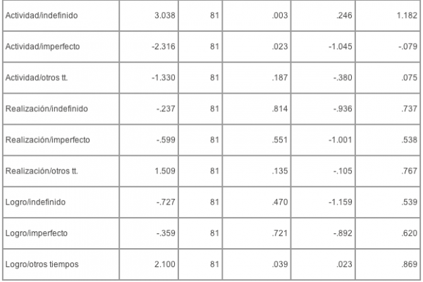 Pasando al análisis de ítems, los verbos que han acertado menos son “ir”, “ser”, “dirigirse”, “llevar” y “llamar”. Es decir, los verbos de actividad son los que han ofrecido mayor dificultad a nuestros estudiantes de español. En cuanto a la elección del tiempo verbal, los verbos en los que se encuentran diferencias significativas respecto a la elección de tiempo son “ir” (en los dos casos), “tener”, “ser”, “comer” y “llamar”. Al combinar estos resultados con la clasificación del aspecto léxico inherente, los datos estadísticos indican que existen diferencias significativas en los apartados de actividad/indefinido, actividad/imperfecto y logro/otros tiempos. El apartado de estado/indefinido también tiene un significado bilateral (P=0.063) bastante cerca al significativo (p<0.05). De todos modos, se puede inferir que el tipo “actividad” puede ser el más problemático.
