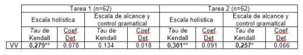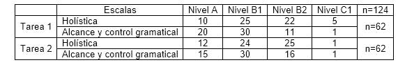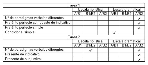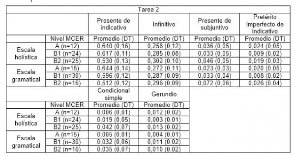 En cuanto a los textos de la tarea 2, el contraste de Kruskal-Wallis muestra que las diferencias entre los promedios solo resultan significativas para dos paradigmas verbales en los niveles establecidos por la escala de alcance y control gramatical: el presente de indicativo (H=7,571; p=0,023) y el de subjuntivo (H=7,717; p=0,021). El test Games Howell señala que esas formas no distinguen entre niveles consecutivos pero sí lo hacen entre A y B2 (p<0,05).