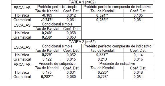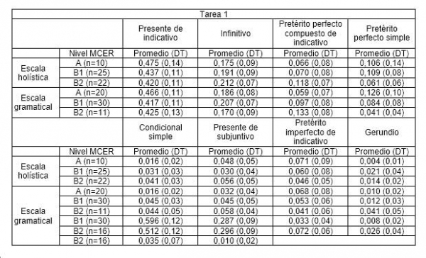 Cuando se aplica el contraste Kruskal-Wallis a los promedios obtenidos en los textos de la tarea 1, los datos muestran que, si consideramos la aplicación de las dos escalas, solo habría diferencias estadísticamente significativas en los valores promedio del pretérito perfecto compuesto de indicativo (H=8,404; p=0,015 en la escala holística y H=9,451; p=0,009 en la escala gramatical). También las habría, según la clasificación basada en la escala de alcance y control gramatical, en el uso del condicional simple (H=8,542; p=0,014) y el pretérito perfecto simple (H=7,571; p=0,023).
