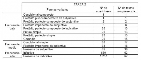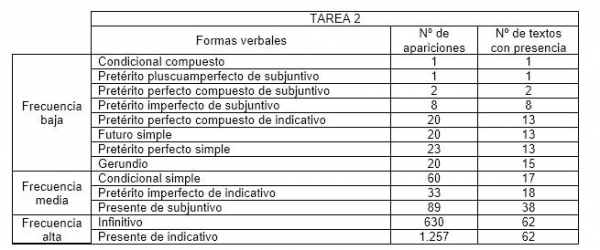 Como ya se ha indicado, además de la variedad verbal en general, teníamos interés en observar más de cerca el comportamiento en nuestros textos de los diferentes paradigmas verbales analizando su frecuencia de aparición. Como era de esperar, las frecuencias difieren mucho de unas formas a otras. Dos de los paradigmas rastreados no aparecen en ningún texto de la tarea 1: el condicional compuesto y el futuro compuesto. Esta última forma, junto con el imperativo y el pretérito pluscuamperfecto de indicativo, tampoco aparece en ningún texto de la tarea 2. En cuanto a los tiempos verbales que sí aparecen en los textos, hemos considerado tres grupos: