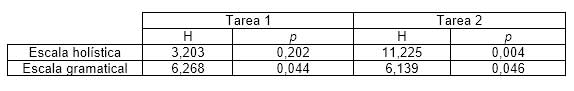 Para saber si las diferencias entre las medias obtenidas tienen significación estadística hemos utilizado la prueba de Kruskal-Wallis, un test no paramétrico que se aplica en lugar de la prueba F de ANOVA cuando se violan los supuestos de normalidad y homogeneidad de varianzas. También es una prueba idónea cuando las muestras son pequeñas y los tamaños muestrales son desiguales, como es nuestro caso (Herrera, Martínez y Amengual, 2011). Los resultados de la prueba muestran que las diferencias tienen significación estadística, a excepción de las que arroja la escala holística en los textos de la tarea 1. Se pueden ver los resultados del test en la tabla VII.