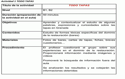 Una vez hecho el sondeo, el profesor y el grupo de alumnos deciden hacer en clase unos itinerarios o rutas para ir de tapas por la ciudad y se les pide que formen pequeños grupos para salir y anotar todo lo que les sorprendan sobre las tapas (nombres, ingredientes, formas de pedirlas y comerlas, modo de servirlas, y todo aquello que destaquen los alumnos).