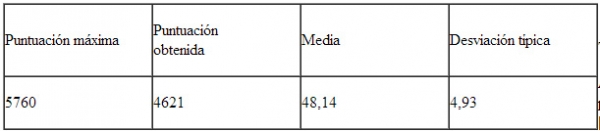 En cuanto al grado de motivación del grupo en la clase de E/LE, se observa que es alto, puesto que la puntuación media es de 48,14 en una escala de 1 a 60 puntos (véase la siguiente tabla).