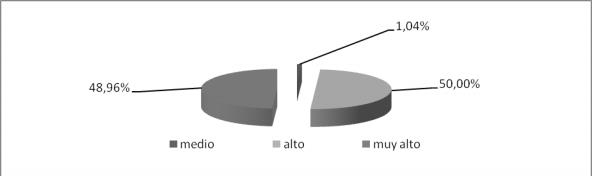 Ahora bien, el análisis individual revela que, conforme a la distribución de la puntuación en las categorías de los resultados del apartado II del cuestionario [muy bajo (1-12); bajo (13-24); medio (25-36); alto (37-48) y muy alto (49-60)], la mayoría de los informantes tiene un grado de motivación entre alto (50%) y muy alto (48,96%) independientemente del tipo de motivación que sea, este resultado confirma que estos universitarios están motivados para aprender la LO (véase la siguiente gráfica).