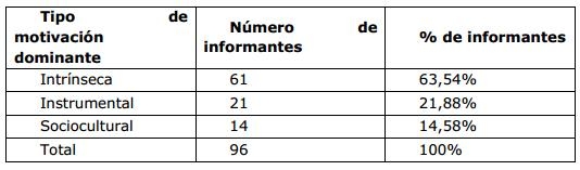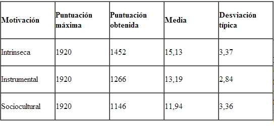 En lo que se refiere al tipo de motivación para aprender el E/LE, la motivación dominante para aprender el E/LE del grupo tomado como una unidad es la intrínseca. En segundo lugar, se encuentra la motivación instrumental y, por último, la sociocultural (véase la siguiente tabla).