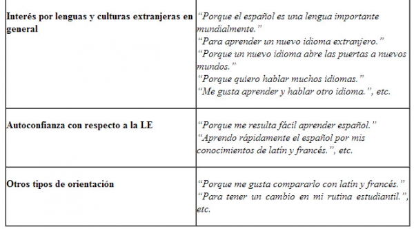 Además, el cuestionario ha revelado diferentes tipos de orientaciones motivacionales clasificadas tomando en cuenta diferentes taxonomías, especialmente los modelos de Dörnyei (1994), Clément, Dörnyei y Noels (1994) y Gardner (1985). La clasificación resultante incluye las siguientes categorías.