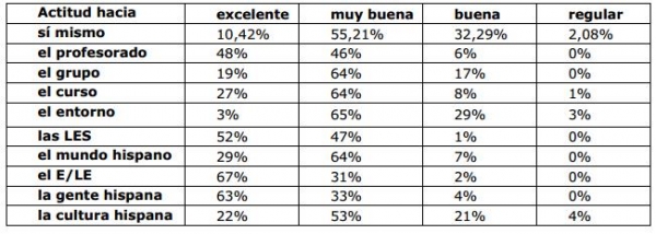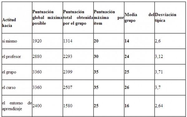 De acuerdo con el análisis global y según los baremos utilizados en cada uno de los apartados del cuestionario dedicados a las actitudes hacia los diferentes factores del aprendizaje del E/LE tomados en cuenta en esta investigación, presentamos en la tabla a continuación las medias encontradas según el análisis global, es decir tomando la puntuación obtenida del grupo total de informantes.