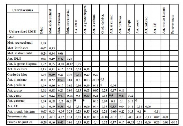 Dado al auge de la investigación sobre estas variables en el campo de LE, que se ha observado en los últimos años, hay incluso trabajos interregionales que incluyen el aprendizaje de más de una LE en el contexto universitario. Aquí cabe destacar los estudios llevados a cabo por Grotjahn (2004) en los que participaron 427 estudiantes de las universidades alemanas de Duisburg y Bochum, así como también de la de Portsmouth, en Inglaterra. La mayoría de los estudiantes alemanes estaba en el primer año de inglés y francés, mientras que los estudiantes ingleses cursaban el segundo o cuarto año de español, francés o alemán. Los resultados sostienen que mientras más positiva es la actitud hacia la LE, más alta es la motivación, mejores resultados hay en el test lingüístico y, además, el grado de ansiedad es más bajo. En cuanto a las correlaciones positivas que se encontraron entre la motivación y las otras variables, se verifica que mientras más alto es el grado de motivación, se registra más extroversión, menos ansiedad al usar la LO, mejor actitud hacia la L2 y ―en los universitarios alemanes― mejores resultados del test lingüístico.
