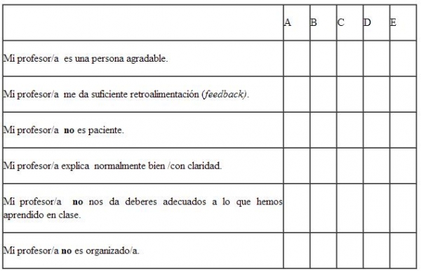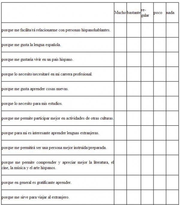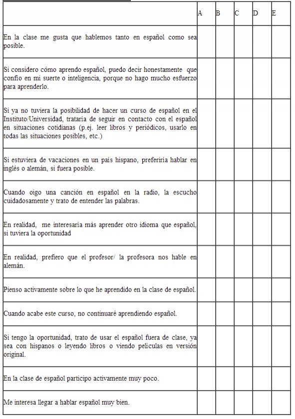 El cuestionario utilizado en la presente investigación se compone de 6 apartados (véase el anexo). En algunos casos hay apartados que tienen más de una parte, puesto que miden más de un aspecto. El apartado I se presentan 12 razones para aprender el E/LE con el objetivo de identificar el/los tipo(s) de motivación que tienen los informantes y averiguar cuáles son los dominantes. El apartado II está diseñado con el propósito de averiguar el grado en el que nuestros informantes están motivados para aprender la LO. El apartado III tiene el objetivo de saber la actitud que los informantes tienen hacia sí mismos como aprendientes del E/LE. El apartado IV está compuesto por 4 partes que abarcan los componentes (tanto humanos: profesor y grupo de compañeros, como no humanos: curso, material didáctico y entorno) de la situación del aprendizaje, considerados en el modelo de Dörnyei (1994). El apartado V tiene el objetivo de conocer la actitud que los aprendientes tienen hacia las lenguas extranjeras, en general. Y, finalmente, el sexto apartado tiene como fin averiguar la actitud de los informantes hacia lo hispano, es decir, hacia la lengua, la gente, la cultura y “el mundo” hispanos. Hay que resaltar que existe un baremo para cada uno de los apartados que componen el cuestionario lo que hace posible para investigaciones futuras la aplicación de los apartados por separado según lo que el profesor o investigador quieran medir en clase (para mayor información véase Minera Reyna, 2009c).