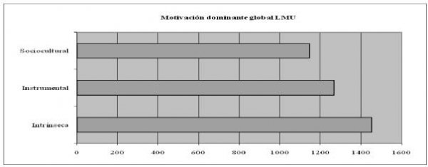 En cuanto al valor que es posible obtener en cada tipo de motivación, hay que decir que el valor máximo es de 1920 puntos (96 informantes que podría obtener un máximo de 20 puntos), por lo que el valor mínimo es de 1. Según la tabla anterior, la motivación dominante (intrínseca) del grupo tomado como unidad ha puntuado un total de 1452 puntos, seguida de la instrumental con 1266 puntos. Por último, se encuentra la sociocultural con 1146 puntos por lo que se considera menos dominante del grupo (véase la siguiente gráfica).