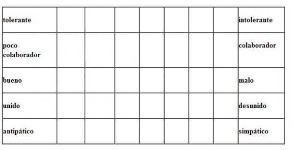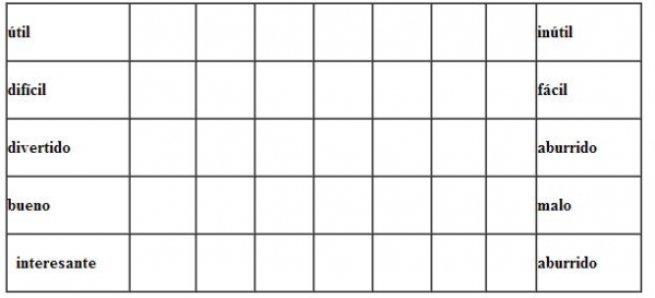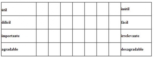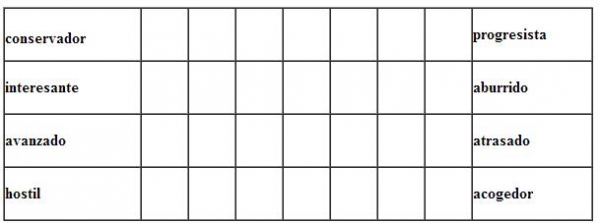 A continuación, encontrará una serie de PALABRAS OPUESTAS de las que tiene que elegir la que se acerque más a su opinión. Puede elegir un punto intermedio cuando no esté seguro/a. Marca su decisión con una (X).