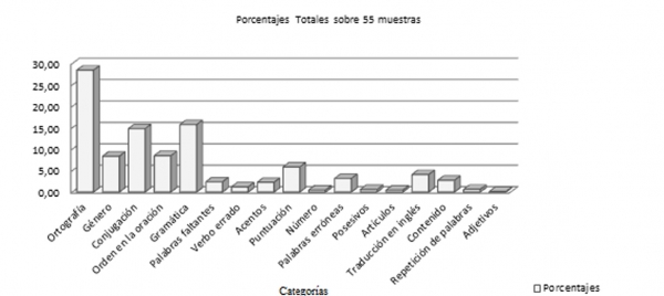 En general, el valor porcentual de la gramática puede considerarse el más alto, si se tiene en cuenta que: género, conjugación, número, artículos, adjetivos, selección verbal y posesivos, son sub-categorías gramaticales. En otras palabras, al revisar las muestras, la gramática (41.88%) fue la categoría principal de evaluación de los grupos de estudio, seguida de la ortografía, incluyendo la acentuación (30.73%).