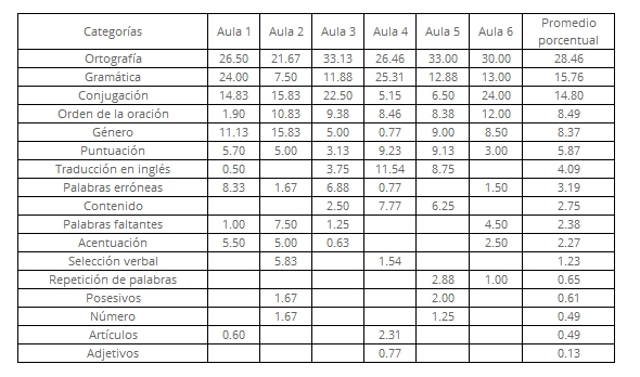 En la Tabla 1 se observan los porcentajes de las categorías de error establecidas por aula y el valor porcentual total de cada categoría a nivel inter-grupal. Se determinó que las categorías de ortografía (28.46%), gramática (15.76%) y conjugación (14.80%) prevalecieron sobre el resto de las categorías escogidas por los estudiantes, cuando se realizaron comparaciones entre las seis aulas. Les siguieron en forma descendente, las categorías de: orden en la oración (8.49 %), género (8.37%), puntuación (5.87%), traducción en inglés (4.09%), palabras erróneas (3.19%), contenido (2.75%), palabras faltantes (2.38%), acentuación (2.27%), selección verbal (1.23%), repetición de palabras (0.65%), posesivos (0.61%), número (0.49%), artículos (0.49%) y adjetivos (0.13%), respectivamente.