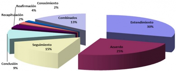 En nuestro corpus, se han producido 143 TA. Los más frecuentes han sido los apoyos de entendimiento (31%), seguidos por los apoyos de acuerdo (26%), seguimiento (15%) y conclusión (9%). Los menos frecuentes, a distancia de los citados, han sido los apoyos de reafirmación (3%), recapitulación (2%) y conocimiento (1%). Por lo que se refiere a los tunos de apoyo combinados, de los 143 TA totales, hemos encontrado el 13% de los casos. Representamos estos datos en el siguiente gráfico.