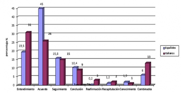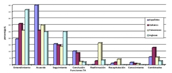 No obstante, y aunque tengan menor peso en términos de frecuencia, existen algunas diferencias que consideramos importante señalar. Los italianos emitieron: más TA de entendimiento que los taiwaneses y menos que los ingleses; menos TA de acuerdo que los taiwaneses y más que los ingleses; más TA de seguimiento que los taiwaneses y menos que los ingleses.
