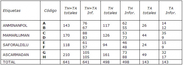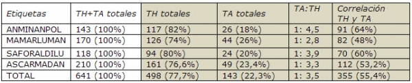 Si comparamos la relación entre la producción de TH y TA, observamos que en las conversaciones SAFORALDILU y ANMINANPOL, en las que se produjo un menor número de TH, hubo una correlación menor entre TA y TH, mientras que la correlación fue mayor en las dos que presentaron un mayor número de TH (ASCARMADAN y MAMARLUMAN). Es decir que, en las conversaciones con menor interacción oral, hubo más TH por TA emitido. Viceversa, cuando hubo mayor interacción, se produjeron menos TH por TA.