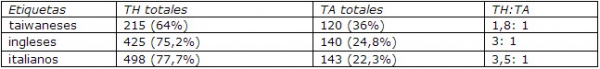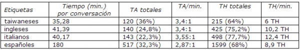 Estos datos indican que los taiwaneses, al producir 20 TA más que los ingleses, han mantenido 190 TH más. Por nuestra parte, los informantes italianos han emitido 3 TA más que los ingleses y 23 TA más que los taiwaneses, contribuyendo en la conversación con un aumento de 73 TH y 283 TH más, respectivamente.