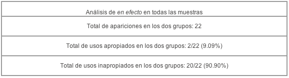 Resultados del análisis de en efecto en cuanto a sus usos apropiados e inapropiados. Los usos apropiados del marcador constituyen sólo el 9,09% del total de sus apariciones: