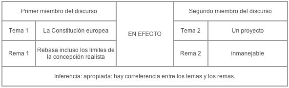En este ejemplo, el marcador en efecto explica y/o confirma, en el segundo miembro discursivo, la idea que aparece en el primero. Pero, además, establece dos equivalencias: por un lado -marcado en azul-, la palabra “proyecto” remite al conjunto “Constitución europea”; por otro lado -marcado en rojo-, la frase “es inmmanejable” remite a la expresión “rebasa incluso los límites de la concepción realista”. Así: