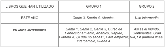 Para el análisis de los libros se tomaron, del Grupo 1, los manuales que habían sido utilizados por los informantes tanto este año como en años anteriores (Gente 3, Sueña 4 y Abanico) y, del Grupo 2, solamente los manuales que habían utilizado en años anteriores (Así es el mundo, Continentes, Gran Vía, En primera línea) [4].