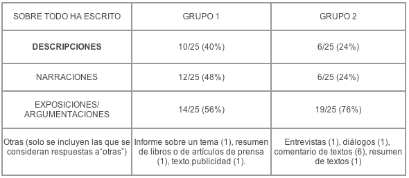 - En cuanto a las experiencias previas de aprendizaje: los informantes del Instituto Cervantes han estudiado con manuales que siguen un enfoque comunicativo o por tareas, que incluyen tipologías textuales (Sueña 4) y la enseñanza de los marcadores se orienta a partir de funciones donde estos mecanismos aparecen contextualizados (Gente 3, Abanico). Los informantes que provienen de liceos han estudiado con manuales que siguen un enfoque gramatical-textual. Estos manuales no incluyen la enseñanza de las tipologías textuales y la enseñanza de los marcadores no se orienta a partir de funciones comunicativas, sino traducidos desde la L1 (en algunos casos con traducciones inapropiadas) y sin aparecer contextualizados. Los dos grupos han utilizado diversos materiales de apoyo aparte del libro de texto. Finalmente, los informantes del Grupo 1 han practicado todas las tipologías textuales, mientras que los del Grupo 2 han practicado sobre todo argumentaciones y exposiciones.
