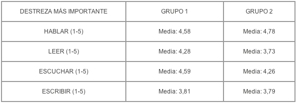Obtener información sobre el “comportamiento escritor” de los alumnos (preguntas 5.c, 5.d, 5.f, 5.h, 5.i). La pregunta 5.c. buscaba obtener información sobre la importancia que los informantes acuerdan a cada una de las destrezas. Las respuestas muestran que, en general, los alumnos de los dos grupos dan más importancia a las destrezas orales que a las escritas. Dentro de las destrezas orales, para los informantes del Grupo 1 escuchar es la más importante, mientras que para los del Grupo 2 lo es hablar, si bien ambos grupos valoran con alta puntuación las destrezas que consideran en segundo lugar según orden de importancia (hablar: 4,58 para el Grupo 1; escuchar: 4,26 para el Grupo 2). En cuanto a las destrezas escritas, la mayor diferencia que se aprecia en las respuestas de los grupos tiene que ver con la lectura (4,28 Grupo 1 frente a 3,73 para el Grupo 2). Finalmente, escribir parece ser para todos los informantes la destreza menos importante en clase: