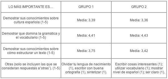 La pregunta 5.d., formulada para conocer la opinión de los informantes sobre lo que consideran más importante a la hora de escribir un texto en español reveló que, en general, los dos grupos coinciden en lo que se refiere a la importancia que dan a los parámetros señalados: lo más importante es demostrar que dominan la gramática y el vocabulario (4,41 para el Grupo 1; 4,43 para el Grupo 2), seguido de demostrar sus conocimientos sobre cómo estructurar un texto (3,75 para el Grupo 1; 3,42 para el Grupo 2), mientras que lo menos importante para ambos grupos es demostrar que tienen conocimientos sobre cultura española (3,39 para el Grupo 1; 3,36 para el Grupo 2):
