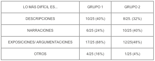 El objetivo de la pregunta 5.f. era obtener información sobre la dificultad que los informantes otorgan a la redacción de cada tipología textual. Si bien los datos muestran que los alumnos de los dos grupos perciben como más difíciles las tipologías expositiva y argumentativa, esta percepción parece mayor para los alumnos del Grupo 1 (68%) que para los del Grupo 2 (48%). Por otro lado, si la narración es la secuencia textual más fácil para los informantes del Cervantes (24%), no lo es para los de la universidad (40%), grupo para el que la tipología que presenta menos dificultad es la descripción (32%):