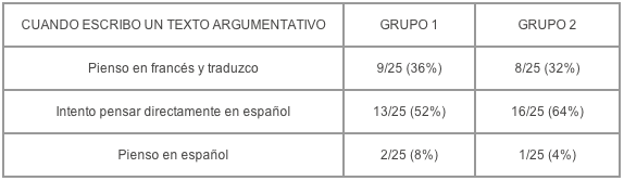En cuanto a la pregunta 5. h., diseñada para conocer el recurso de los alumnos a su L1 cuando redactan textos argumentativos en ELE, muestra resultados muy similares entre los grupos: la mayoría de los informantes declara que intenta pensar directamente en español (52% en el G. 1 y 64% en el G. 2), los porcentajes en lo que se refiere al número de alumnos que declara pensar en su lengua materna y traducir al español cuando escriben textos argumentativos son muy similares (36% en el G. 1 y 32% en el G. 2) y, finalmente, casi ningún informante afirma pensar completamente en español (8% del G. 1 y 4% del G. 2):