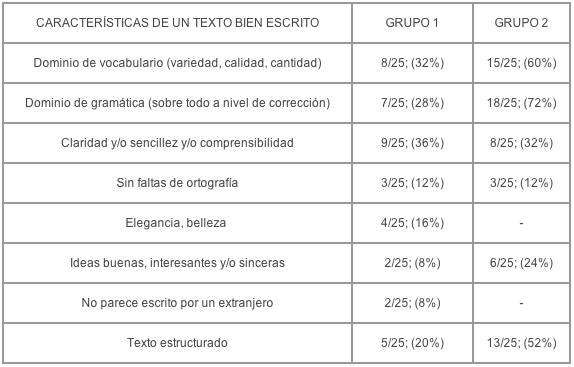 En general, las respuestas parecen señalar que los informantes del Instituto Cervantes definen lo que es un texto bien escrito a partir de una serie muy variada de características, valoradas en una proporción cercana: la comprensibilidad (36%), el dominio de vocabulario, gramática o estructura (32%, 28% y 20% respectivamente), la ausencia de faltas de ortografía (12%), la presencia de buenas ideas (8%), ideas relativas a la belleza o elegancia del texto (16%) y a que el escrito no parezca extranjero (8%). Frente a estos datos, las respuestas dadas por los alumnos de Dauphine son más homogéneas tanto en la variedad de ideas señaladas como en el porcentaje de alumnos que las incluyen en su definición: así, la corrección gramatical no sólo es la característica más valorada sino que aparece incluida en las respuestas del 72% de los informantes. Este fenómeno también se manifiesta en rasgos como dominio de vocabulario y estructura, ambos señalados por más de la mitad de los informantes de este grupo (60% y 52% respectivamente). La comprensibilidad es menos valorada en el Grupo 2 (32%), al igual que la presencia de buenas ideas (24%) si bien esta última característica es más valorada que en el Grupo 1 (8%).