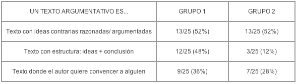 Las respuestas que dieron los informantes señalan que todos conocen lo que es un texto argumentativo. El dato más llamativo es el diferente número de informantes que se refieren a la característica “estructura” en ambos grupos: si para el Grupo 1 este rasgo es definitorio de la secuencia argumentativa en un 48%, solo el 12% de los informantes del Grupo 2 hace mención a este elemento.