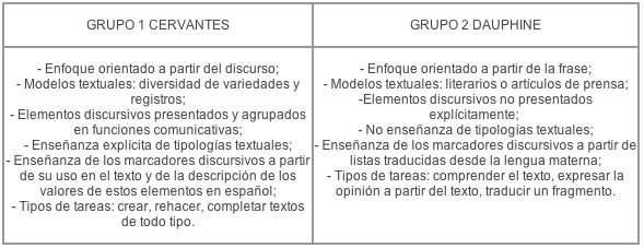 Estos datos muestran que el comportamiento escritor de los alumnos revela perfiles de sujetos con características comunes en lo que se refiere a su preferencia por las destrezas orales, sus objetivos cuando redactan un texto en español, la tipología textual que les resulta más difícil y su nivel de conciencia sobre las diferencias entre su lengua materna y el español cuando escriben un texto argumentativo. Sólo parecen diferenciarse en las características que otorgan a lo que consideran un texto bien escrito. Además, los informantes de los dos grupos conocen lo que es la secuencia textual argumentativa. Lo que diferencia a los dos grupos es el enfoque de enseñanza que caracteriza sus experiencias previas de aprendizaje, lo cual se muestra en el tipo de textos que han practicado y en los enfoques didácticos de los libros utilizados (que responden a diferentes objetivos de enseñanza): los manuales de los dos grupos revelan las diferencias metodológicas de la instrucción recibida por los informantes en sus experiencias previas de aprendizaje, que pueden ilustrarse a partir de la siguiente tabla: