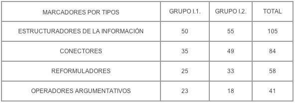 Se obtuvo un total de 288 apariciones de 47 marcadores diferentes. Del Grupo 1 se recogieron 133 apariciones de 35 marcadores diferentes y del Grupo 2, 155 apariciones de 36 marcadores diferentes. En general, los informantes de los dos grupos usaron, de media, el mismo número de marcadores (5.32 en el Grupo 1 y 6.2. marcadores en el Grupo 2).