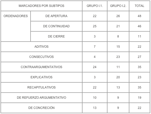 Procedimiento del análisis de los marcadores. Para este análisis setranscribieron todas las muestras, se contabilizaron todos los marcadores discursivos que en ellas aparecían y se agruparon los marcadores usados por los dos grupos en tipos y en subtipos(siguiendo la clasificación de Martín Zorraquino y Portolés, 1999) para hacer un análisis comparativo a partir de valores absolutos, es decir, sin tener en cuenta el número de apariciones según los sujetos.