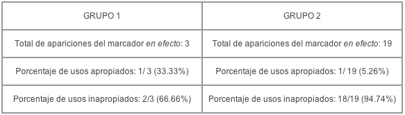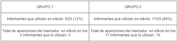 Por otro lado, los resultados revelan que hay una relación entre el porcentaje elevado de apariciones de en efecto y su uso incorrecto, por un lado (Grupo 2: 19 apariciones con 94.74% de usos inapropiados) y el porcentaje limitado de apariciones del marcador, por el otro (Grupo 1: 3 apariciones). Es decir, el hecho de que los informantes del Cervantes sean más “correctos” en cuanto al uso de este marcador está relacionado con el hecho de que no lo utilizan, no con que lo utilicen bien: