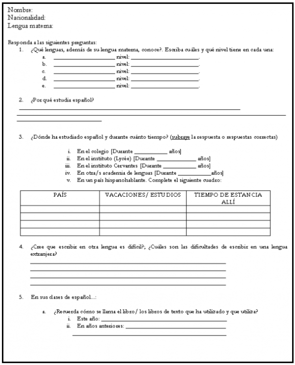Cuestionario. Este cuestionario se ha diseñado para ver las dificultades que tienen los alumnos que estudian español cuando escriben. Muchas gracias por su colaboración. Si tiene alguna duda, no dude en preguntar al profesor.