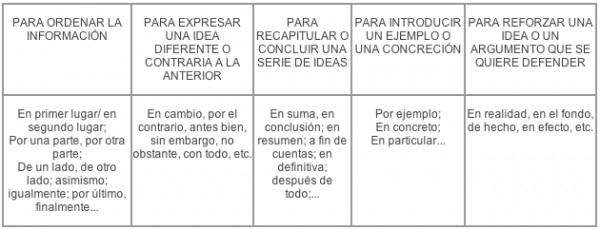 [2] Los parámetros están inspirados en la clasificación de Martín Zorraquino y Portolés (1999): el parámetro “para ordenar la información” recogía marcadores del subtipo ‘ordenadores’ (tipo ‘estructuradores de la información’); el parámetro “para expresar una idea diferente o contraria a la anterior” recogía marcadores del subtipo ‘contraargumentativos’ (tipo ‘conectores’); el parámetro “para recapitular o concluir una serie de ideas” recogía marcadores del subtipo ‘recapitulativos’ (tipo ‘reformuladores’); el parámetro “para introducir un ejemplo o una concreción” recogía marcadores del subtipo ‘de concreción’ (tipo ‘operadores argumentativos’); finalmente, el parámetro “para reforzar una idea o un argumento que se quiere defender” recogía marcadores del subtipo ‘de refuerzo argumentativo (tipo ‘operadores argumentativos’) y el marcador en efecto que, aunque pertenece al subtipo ‘explicativo’, puede ser un marcador que cumpla la función descrita en este grupo: reforzar una idea o un argumento que se quiere defender.