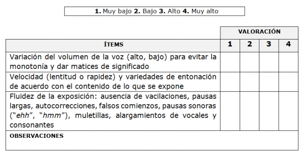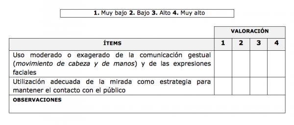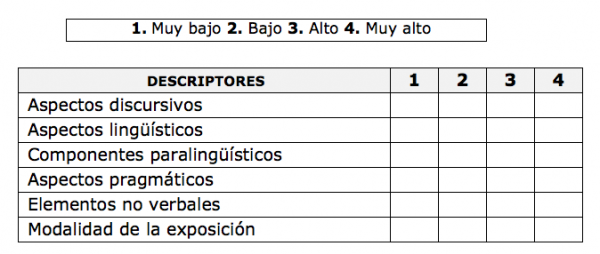 En la primera fase, se redactó una parrilla de forma consensuada, basada en los comentarios y reflexiones de la clase, y con elementos teóricos proporcionados por el profesor, a partir del visionado de las exposiciones orales de los alumnos participantes. Para evitar que dichos comentarios y reflexiones se focalizaran en el análisis de errores gramaticales y de pronunciación, se amplió el comentario sobre la exposición oral incluyendo, además de los aspectos lingüístico-discursivos, los paralingüísticos, los del lenguaje no verbal, y el empleo de apoyos técnicos.