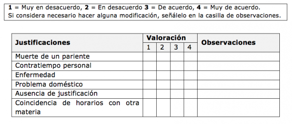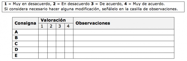 En cuanto a la presentación de los ítems o preguntas para su evaluación, se efectuó de tres modos distintos. Por una parte, se expusieron diferentes afirmaciones que había que valorar en base a una escala de Lickert de 4 puntos en la que se debía expresar mayor o menor acuerdo y en cada pregunta se ofrecía una casilla de observaciones sobre la valoración. Por otra parte, se realizó una pregunta cerrada que proporcionaba dos opciones de respuesta, cuya selección debía realizarse de forma razonada en un espacio de respuesta abierta. Por último, se pidió una clasificación ordinal de los ítems en función de las preferencias del examinador, en la que se debía colocar en primer lugar la preferida y en el último la que se consideraba menos seleccionable; este tipo de pregunta también incluía una parte abierta en la que se debía justificar la respuesta.