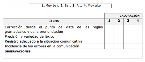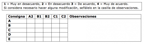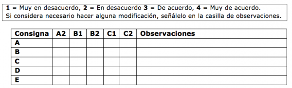 Se creó un cuestionario de validación de 8 preguntas (véase Anexo 2) en el que se pidió la valoración de los expertos sobre los siguientes aspectos: la equivalencia pragmática de las versiones traducidas de cada consigna, la claridad en la formulación de las consignas, el grado de imposición de la petición descrita, los factores que afectan al grado de imposición, la adecuación de las consignas a los diferentes niveles de competencia lingüística (A2, B1, B2, C1 o C2), según el Marco Común Europeo de Referencia para las Lenguas (MCER), y la adecuación del vocabulario específico de cada nivel para realizar el producto textual indicado en la consigna. Para facilitar a los evaluadores un somero recordatorio de las exigencias específicas de cada nivel en la destreza analizada, se adjuntó la escala del MCER para la interacción escrita en general (Consejo de Europa, 2002:82).