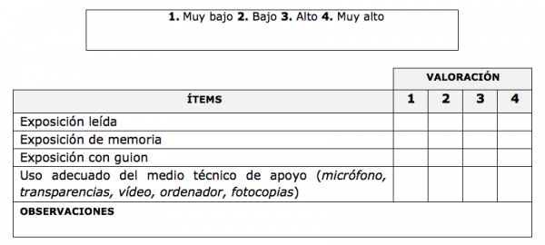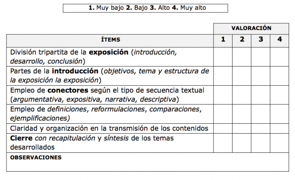 Se solicitó a los alumnos participantes que, después del visionado de las grabaciones del primer ciclo de exposiciones, comentaran y reflexionaran sobre los aspectos discursivos, lingüísticos y pragmáticos de las mismas. Y para evitar la focalización en el análisis de errores, se elaboró una parrilla de corrección –en forma consensuada- sobre las reflexiones y comentarios de la clase y los elementos teóricos proporcionados por el profesor. Dicha parrilla de corrección sirvió como base para la elaboración y negociación de los ítems de un cuestionario destinado a generar un baremo de calificación numérica de la exposición oral académica en clase. Para “legitimar” este baremo inducido, se solicitó a cuatro expertos la validación del mismo a los efectos de ser aplicado durante el segundo ciclo de exposiciones y considerado como una prueba final de cuya calificación numérica son responsables los mismos alumnos, junto a la evaluación personal del profesor.